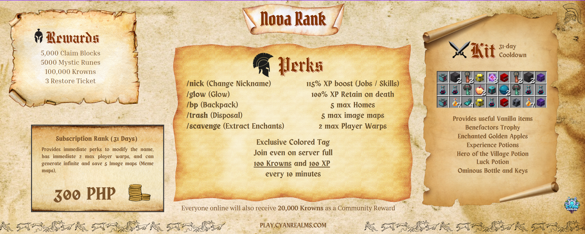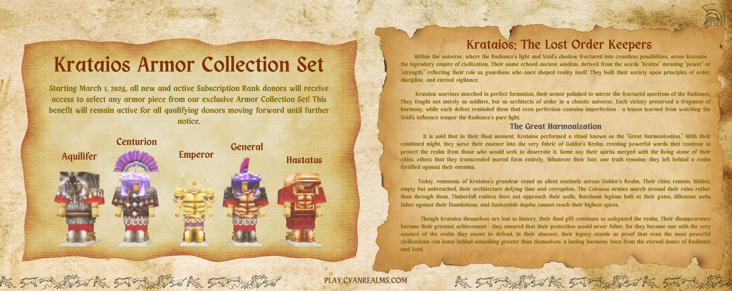 All new and active Subscription Rank donors will receive access to select any armor piece from our exclusive Armor Collection Set! This benefit will remain active for all qualifying donors moving forward until further notice.